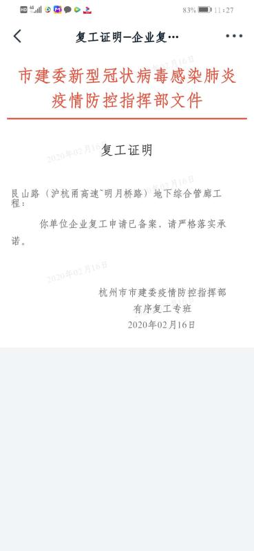 在做好企业和员工自身防护的同时,于2月8日,向企业所在街道提交复工复产报告,并在2月14日,获得滨江区新型冠状病毒感染肺炎疫情防控指挥部和杭州市滨江区人民政府长河街道办事处同意复工复产。