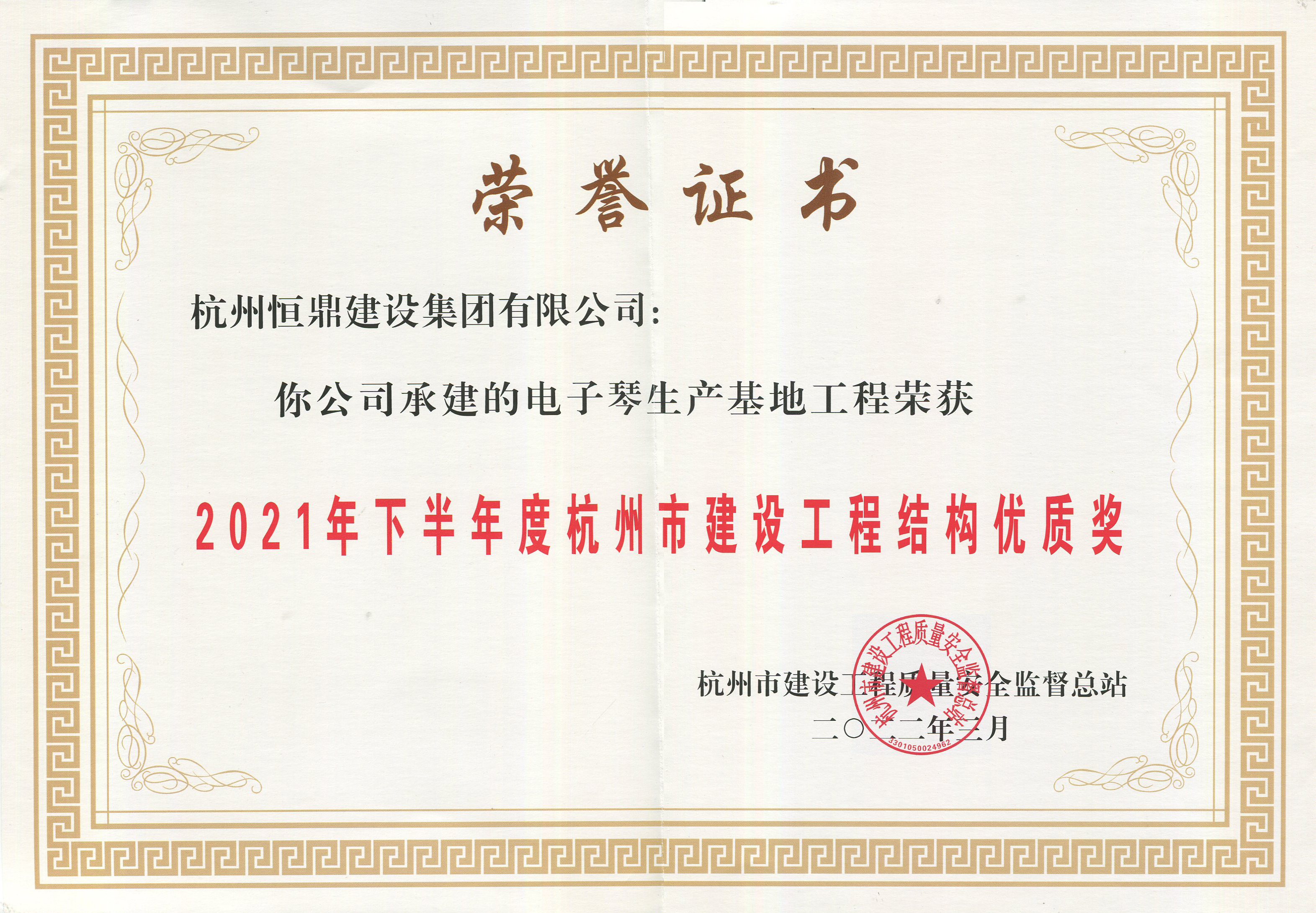 近日,由公司承建的电子琴生产基地项目喜获2021年下半年杭州市建设工程“西湖杯”(结构优质奖)